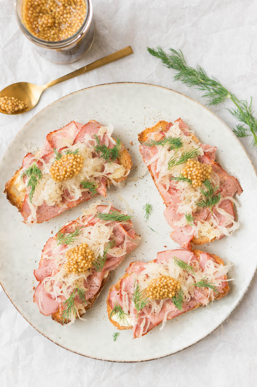 Deze crostini met pastrami, zuurkool en mosterdmayonaise zijn het ideale hapje voor een brunch of een feestje. Tenzij je ze allemaal zelf op wilt eten natuurlijk, want zo lekker zijn ze.