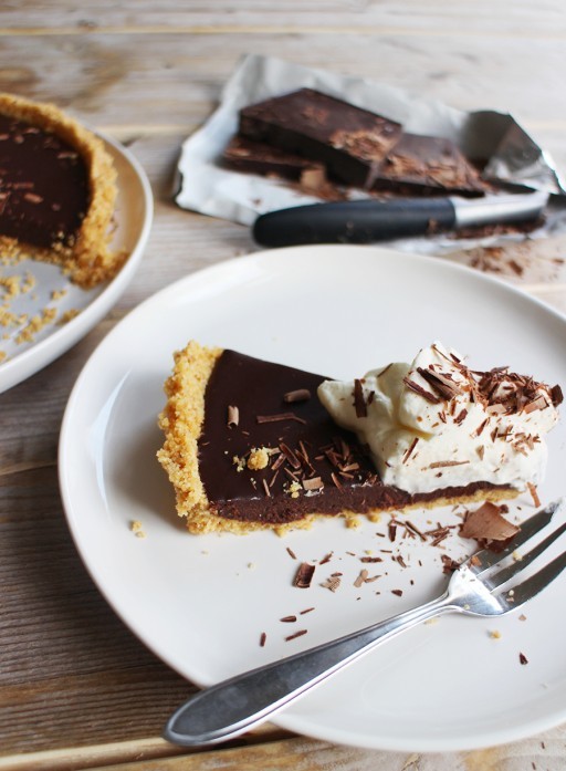 Vul de taartbodem met de ganache en laat minstens drie uur afgedekt opstijven in de koelkast. Serveer met luchtig geklopte slagroom en schaafsels pure chocolade.
