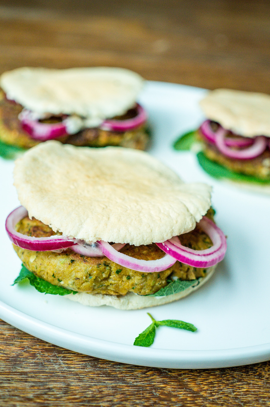Beleg de bodem van de pita met wat blaadjes munt, leg hier de falafel op en maak af met wat roze uienringen.
