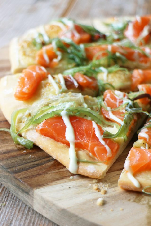Soms lukken gerechten zó goed, dat we jullie bijna willen dwingen om het te maken. Deze flammkuchen met zalm, zeewiersalade en wasabimayo is een goed voorbeeld. Makkelijk om te maken, simpele ingrediënten maar een bom van smaak. Neem het van ons aan: dit wil je proberen!