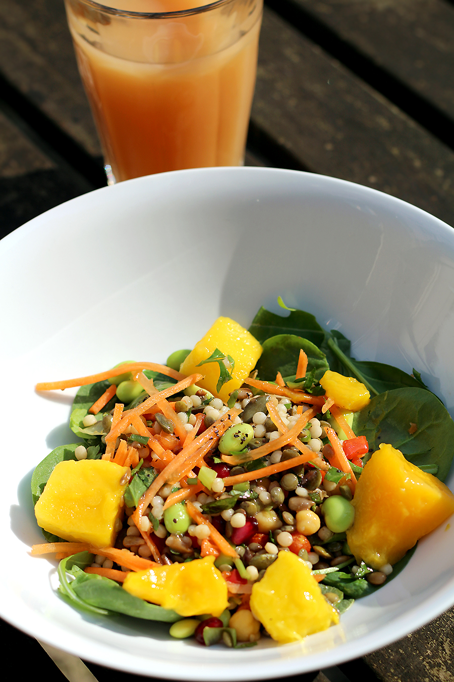 Serveer deze frisse salade met een lekker glas kleurig sap, bijvoorbeeld grapefruitsap.