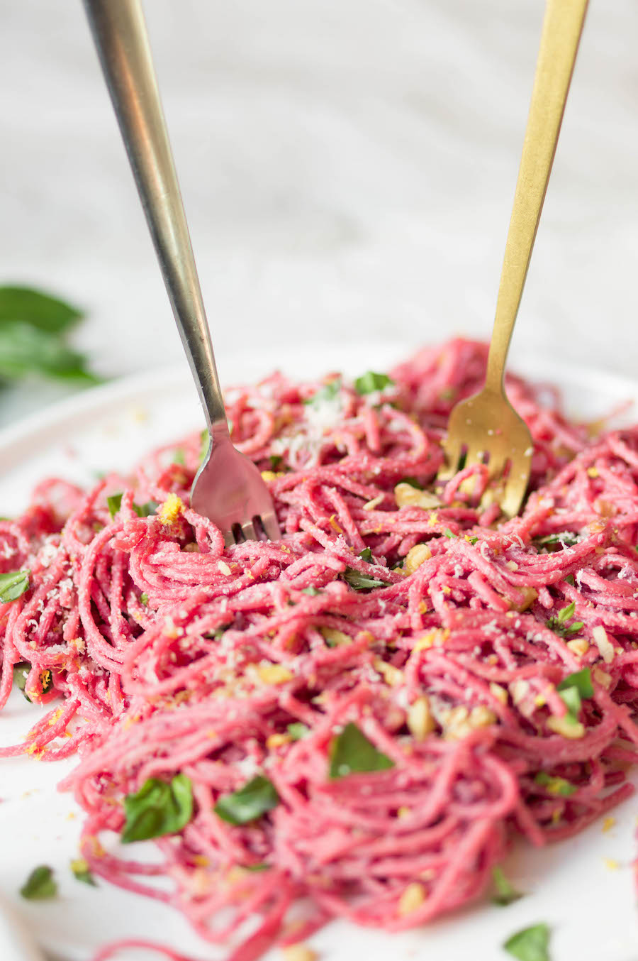 Door een saus van rode biet en ricotta te maken en die door spaghetti te roeren, krijg je roze spaghetti. Het is een heel fris gerecht, met geraspte citroenschil, basilicum, walnoten en Parmezaanse kaas als voornaamste smaakmakers.