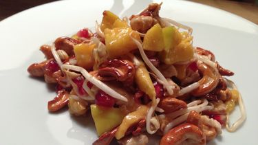 Mix de taugé met de granaatappelpitjes, mango. Bak de cashewnoten in een beetje honing in een paar minuutjes knapperig en goudbruin in een koekenpan. Voeg bij de salade en hussel door. Kruid goed af met zout & peper.
