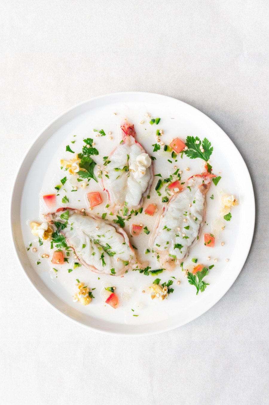 Van ceviche worden we altijd blij. Deze garnalen ceviche is extra speciaal: je eet ‘m met zoute popcorn. Een fiësta in je mond.