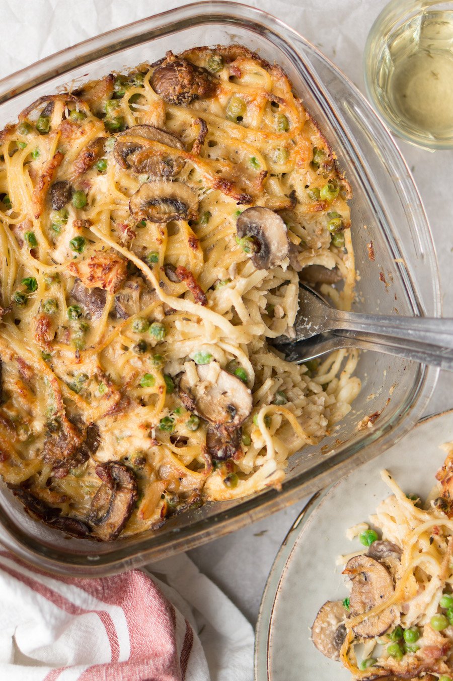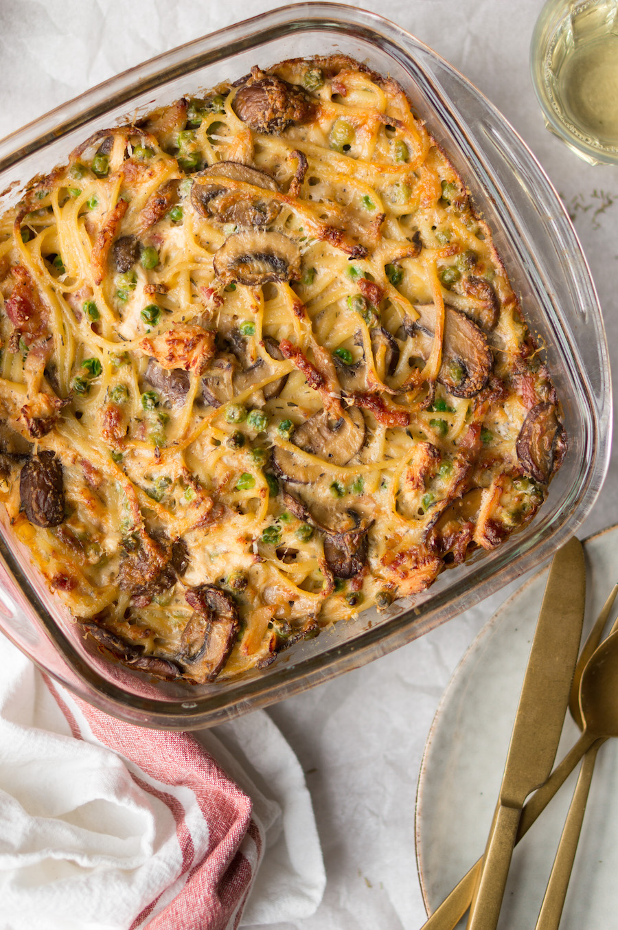 Wist je dat je ook een pastaschotel kunt maken met spaghetti of linguine? Wij maakten deze gebakken spaghetti uit de oven met kip, spekreepjes, champignons en een heleboel Parmezaanse kaas. Want daās altijd goed.