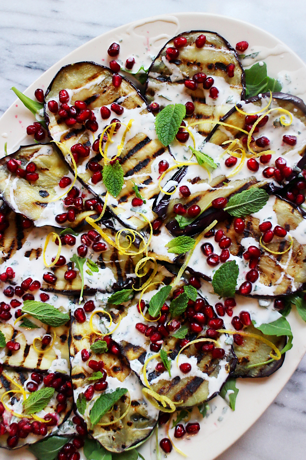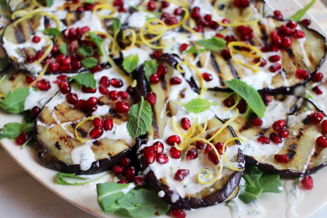 Gegrilde aubergine met yoghurt-muntsaus en granaatappelpitjes