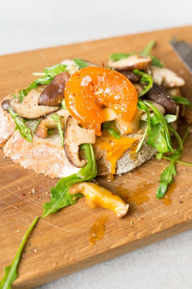 Lekker op toast met gebakken shiitake, knoflook en wat rucola. Serveer de dooier in z’n geheel en maak af met wat Piment d’Espelette of een beetje chilipeper.
