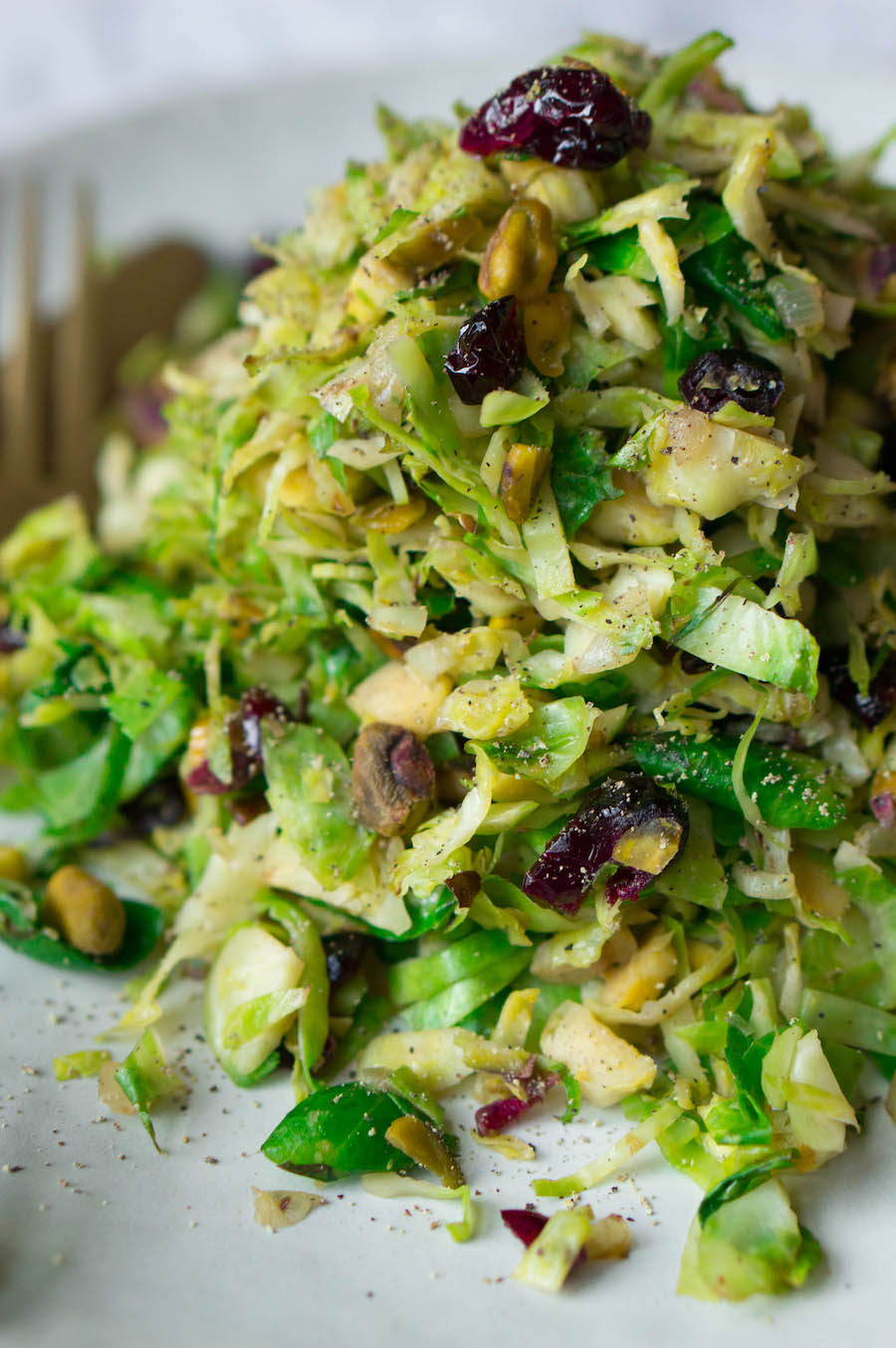 Spruitjes horen echt wel een beetje bij Kerst. Ben je geen fan van de gekookte soort, probeer dan deze geschaafde spruitjes. Knapperig, fris en notig (en dus niet zo bitter als gekookte spruiten weleens kunnen zijn). Ze worden helemaal Kerstmis-worthy met cranberry’s, pistachenoten en Parmezaanse kaas.
