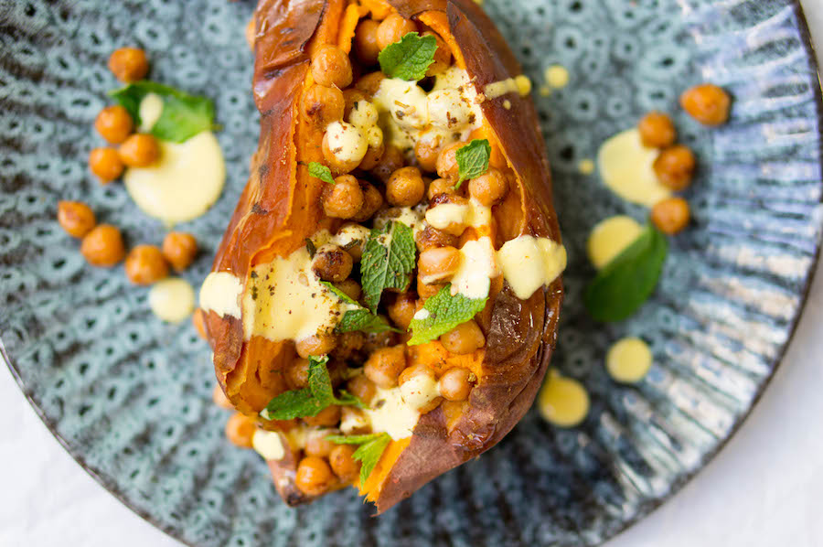 Snijd de gepofte zoete aardappels in de lengte open. Druppel de saffraanyoghurt over de zoete aardappels. Verdeel de kikkererwten erover en bestrooi met verse munt. Maak af met een snufje zaāatar.