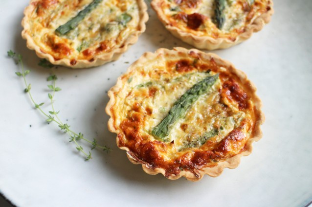 Bedek de vormpjes met het deeg en prik gaatjes in de bodem met een vork. Bedek met bakpapier en blindbakbonen en bak tien minuten voor. Laat iets afkoelen en kluts ondertussen de zure room met de slagroom, eieren, zout en peper naar smaak los. Snijd de groene asperges in twee of drie stukjes, zodat ze in de vormpjes passen.