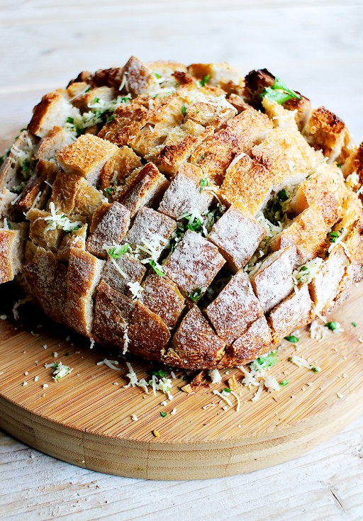 Verwarm je oven voor op 180 graden. Rasp de kaas en hak de peterselie fijn. Meng met elkaar, samen met de chili flakes. Snijd het brood in met een broodmes tot de bodem, maar niet helemaal door. Doe dit voorzichtig en maak plakken van ongeveer twee centimeter breed. Zorg ervoor dat je niet helemaal doorsnijdt, zodat de plakken nog aan de bodem vast blijven zitten.