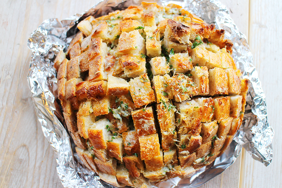 *Tip: wil je het brood van tevoren maken? Dat zouden we je niet aanraden. Wat je wel kunt doen is het brood alvast inkerven en vullen met het mengsel. Pak het alvast in in folie en zet apart.