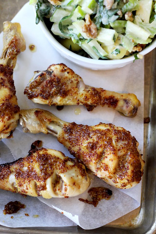 Honing-mosterd drumsticks met een waldorfsalade