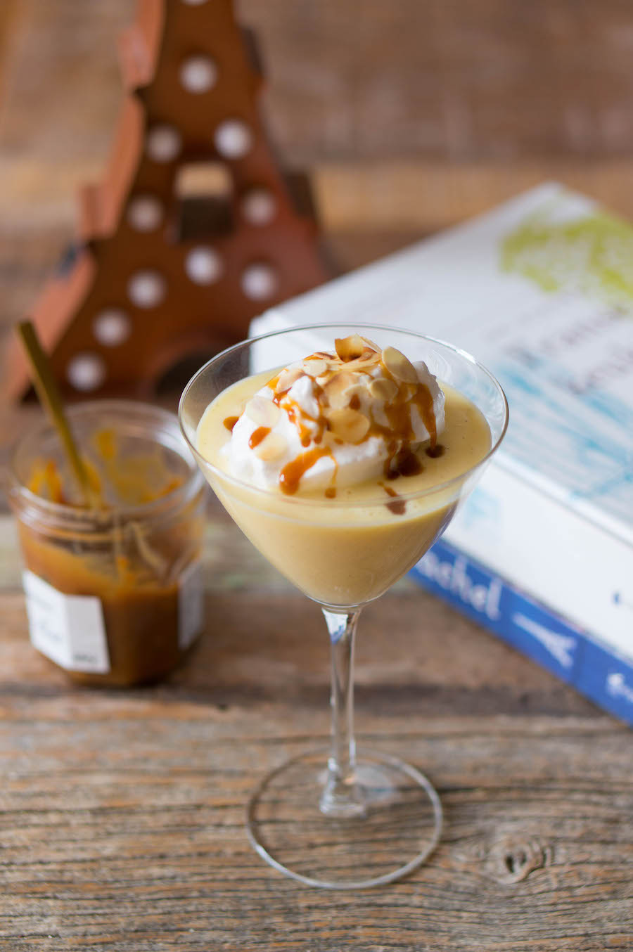 Vaak wordt île flottante afgemaakt met een beetje praliné er bovenop. Dat zijn noten – zoals amandelen of hazelnoten – die krokant zijn gemaakt met wat gekarameliseerde suiker. Wij namen hier een shortcut en gebruikten kant-en-klare salted caramel en wat amandelschaafsel. Maar je kunt natuurlijk ook zelf salted caramel maken!