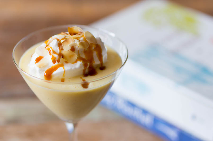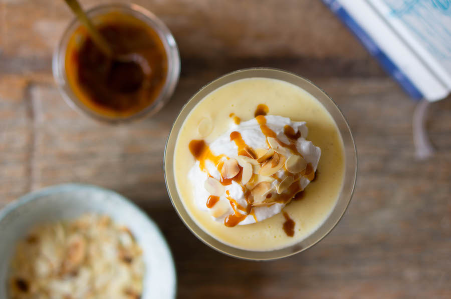 5. Maak de île flottante op door een paar lepels crème anglaise in een glas te scheppen. Leg het eiwitschuim erop, druppel er wat salted caramel overheen en maak af met het amandelschaafsel.