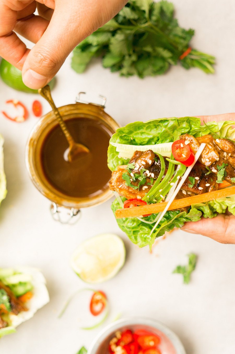 Pak nu telkens een blaadje sla, vul met wat komkommer, wortel en kip. Garneer met reepjes lente-ui, chilipeper en koriander en de overige saus. Besprenkel de taco’s tot slot met wat sesamzaadjes. Lekker met een kneepje limoen eroverheen.