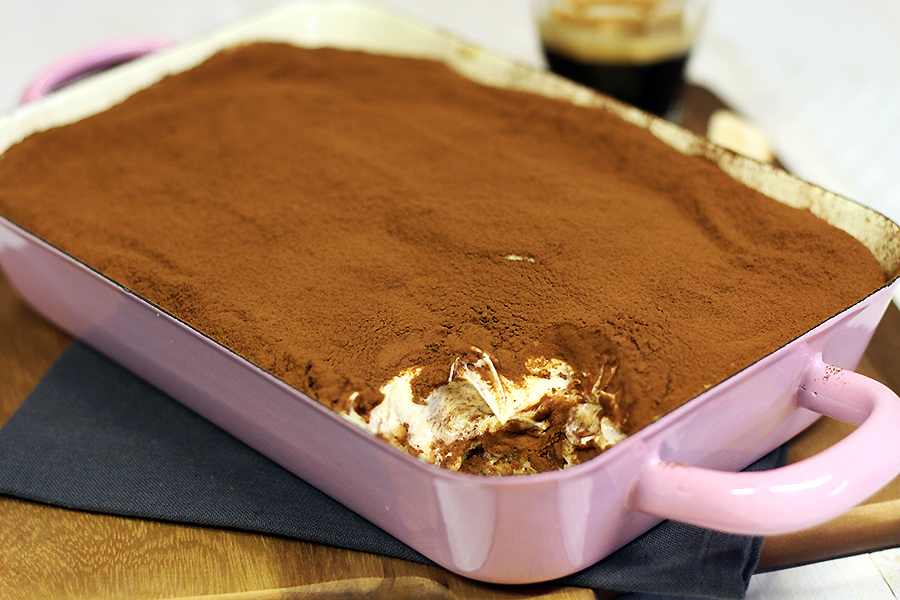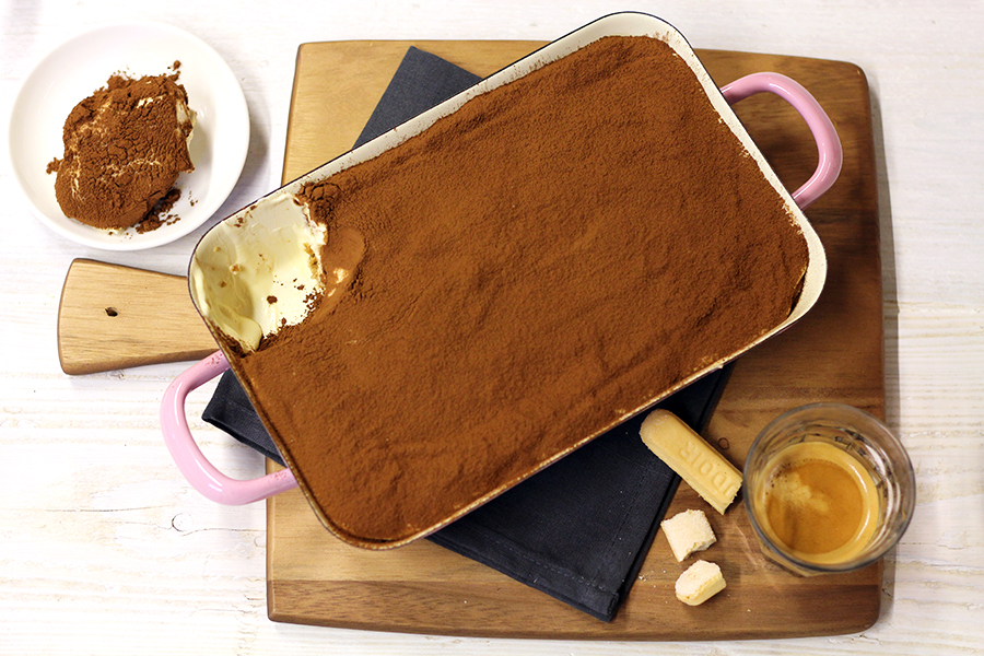 Bedek de bodem van een ruime ovenschaal met de lange vingers en bedek met de helft van het mascarponemengsel. Verdeel de rest van de koekjes erover en top met het resterende mengsel. Bestrooi met gezeefd cacaopoeder en laat twee uur onder vershoudfolie in de koelkast opstijven.