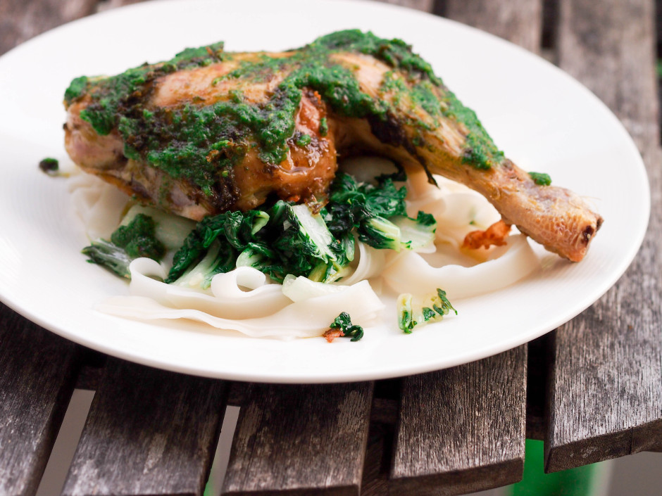 Haal de kip uit de oven. Giet de noodles af en verdeel deze over de borden. Leg de kip erop en besprenkel deze met de saus. Doe ook wat saus over je noodles en serveer met de paksoi.