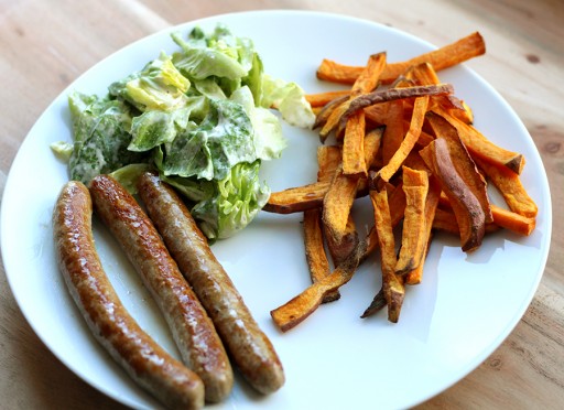 Een heerlijk zomers maaltje voor doordeweeks: lamsworstjes met zoete aardappelfriet & sla.