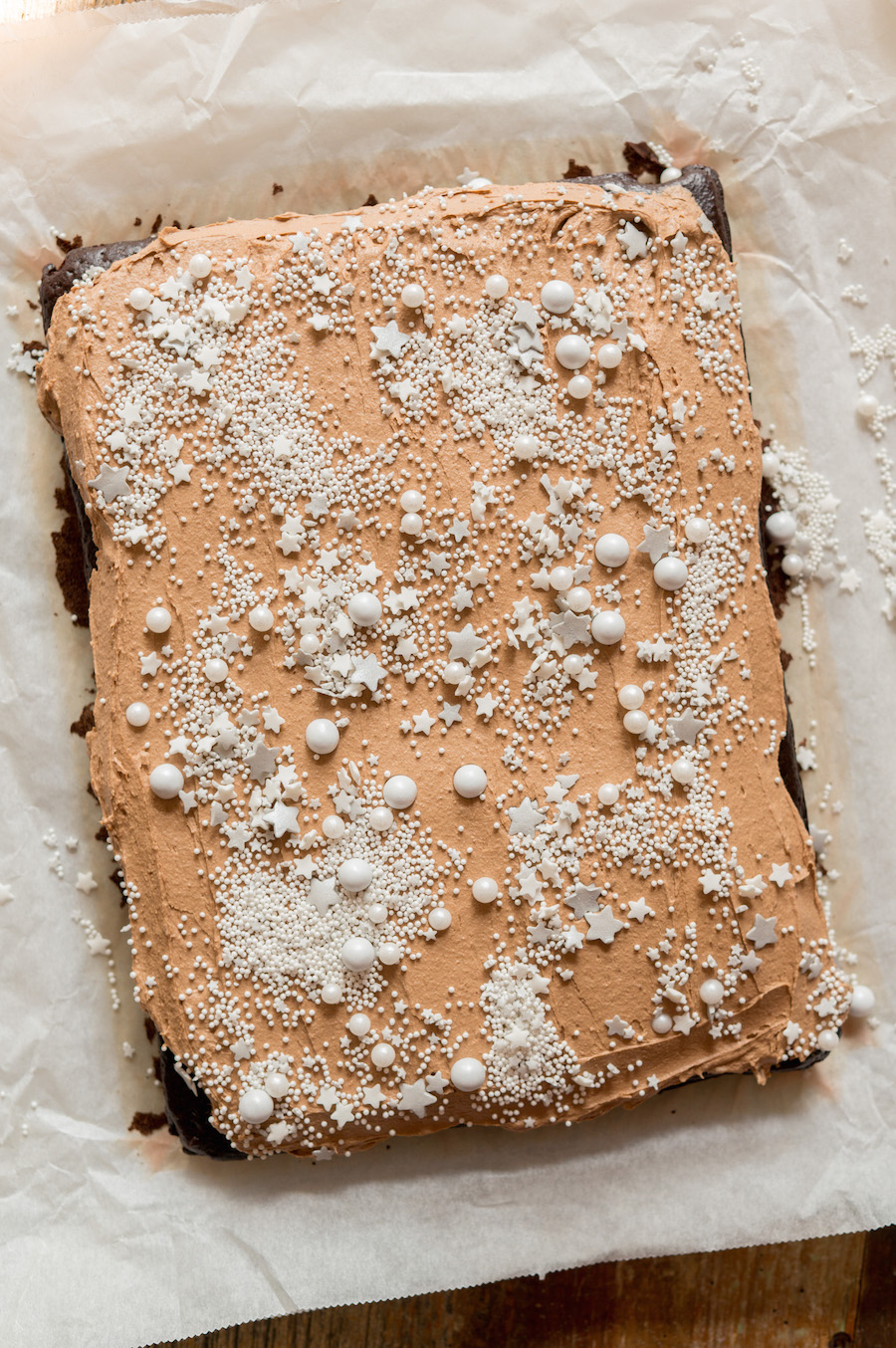 Met deze makkelijke chocoladecake zet je écht iets op tafel, terwijl de uitvoering supersimpel is. Ook fijn: er gaan wel 12 tot 14 stukjes uit zo’n enorme chocoladecake. Mét chocoladeglazuur. En sprinkles.