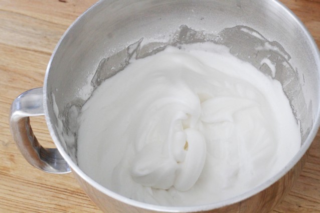 Als je zover bent, voeg je beetje bij beetje (langzaam!) de poedersuiker toe terwijl je door klopt (nog ongeveer 5 minuten). Als alles wit en stijfgeslagen is en je de kom op z’n kop kunt houden zonder dat het eruit loopt, is het goed.