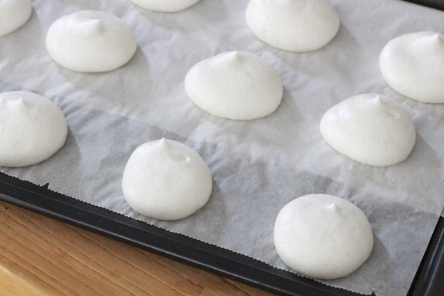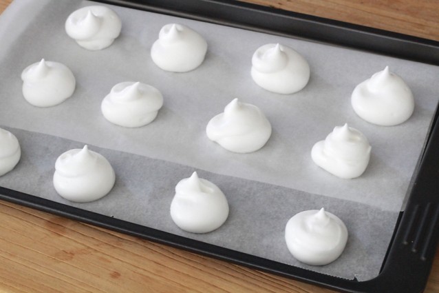 Leg een vel bakpapier op een ovenplaat en maak met een lepel hoopjes van de meringue. Je kunt dit ook heel netjes met een spuitzak met spuitmondje doen. Je kunt ook één grote meringue maken. Wat jij wilt! Let wel; hoe dikker en hoger de hoopjes, hoe langer het duurt voordat het midden ook echt bros en droog is.