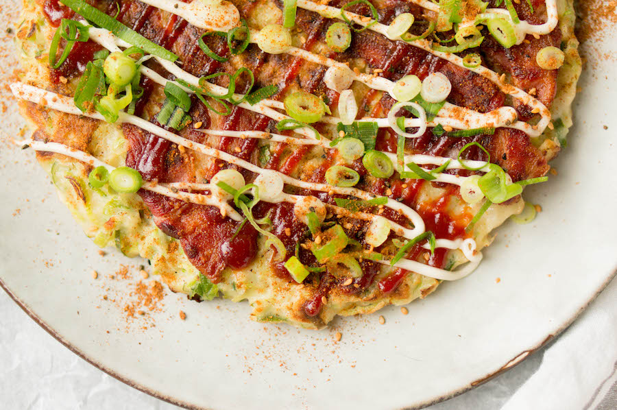 Je kunt dit recept ook vegetarisch maken. Gebruik vegetarische bouillon of dashi en vervang de bacon bijvoorbeeld door gefruite uitjes of wat Japanse wakame (zeewiersalade) bovenop de okonomiyaki. Of check ons recept voor vega okonomiyaki.