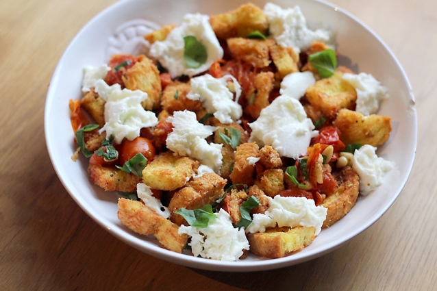 Hussel de krokante stukjes brood met de geroosterde tomaatjes en verdeel over twee borden. Garneer de panzanella salade met de basilicum, pijnboompitjes en mozzarella en maak af met extra olijfolie, balsamico-azijn (of balsamico-stroop) en zout en peper.