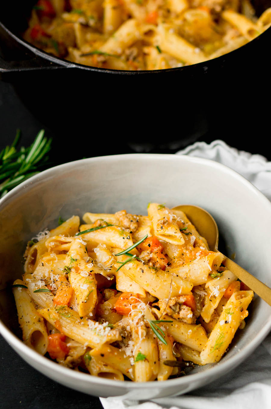 Deze pasta met pompoen, venkel en worst is verschrikkelijk simpel en ook nog eens verschrikkelijk lekker. Wat ‘m zo makkelijk maakt: je maakt het hele gerecht in één pan klaar. Inclusief penne en kookwater. Dit wordt een vast recept in je kookrepetoire.