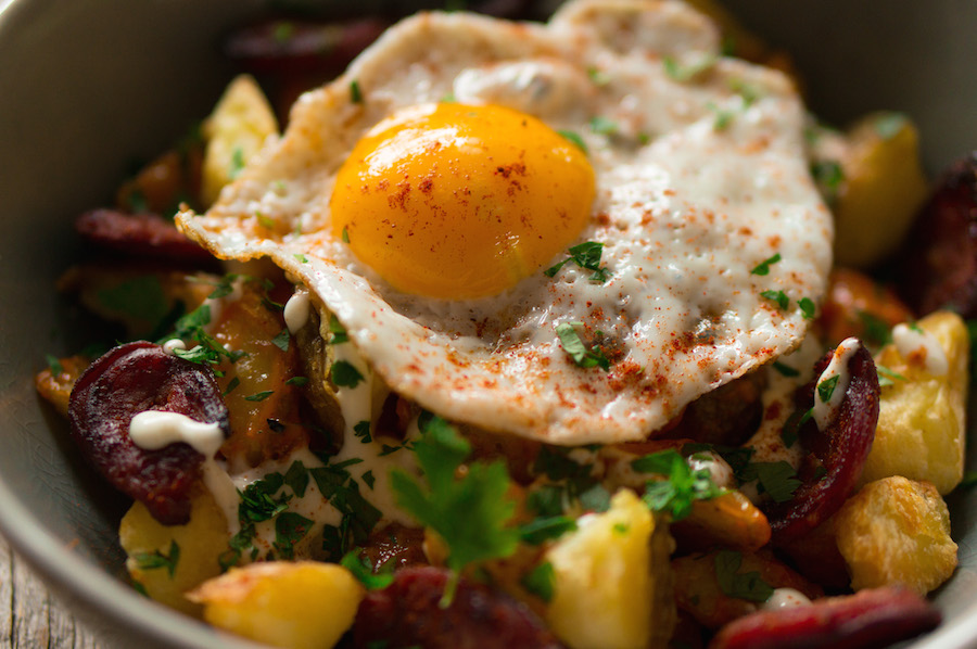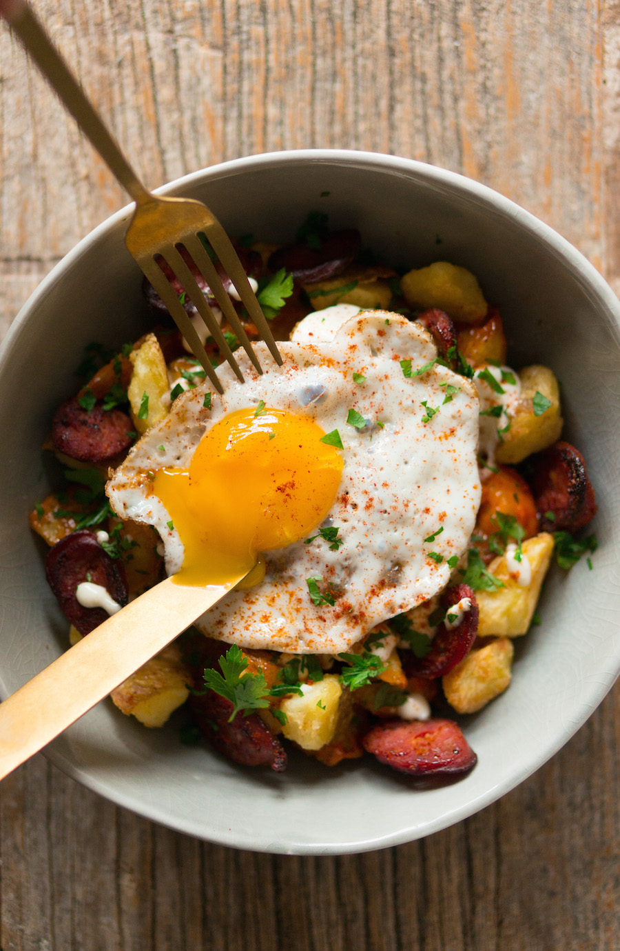 Wat een topidee: knapperige patatas bravas in een lekkere spicy saus, stukjes chorizo en afgemaakt met een gebakken ei. Puur eetgenot!