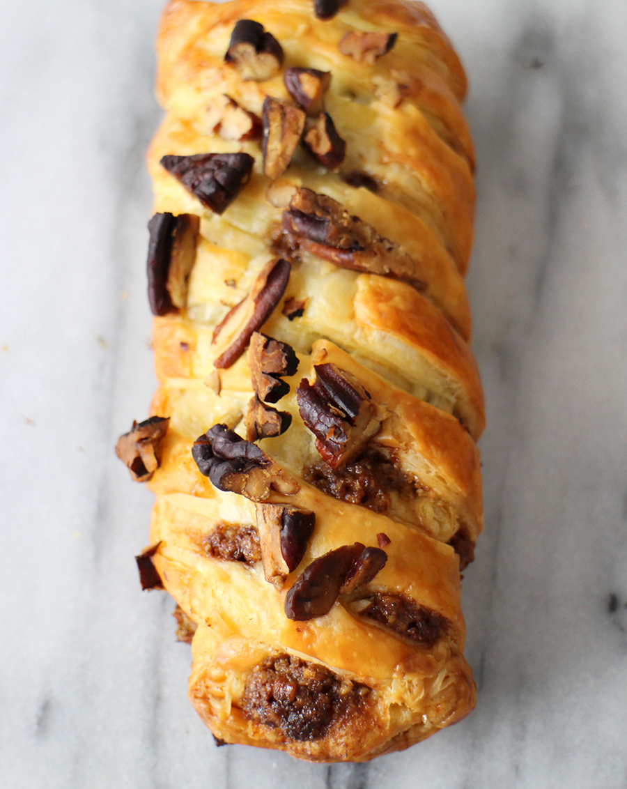 Begin bovenaan met het om en om (dus links en rechts) omvouwen van de strookjes. Als het goed is krijg je nu een soort vlechtwerk. Leg op een met bakpapier beklede bakplaat en bestrijk met het ei. Top met de grof gehakte pecannoten en bak 20 Ć 25 minuten in de oven of totdat de pecanbroodjes goudbruin zijn.