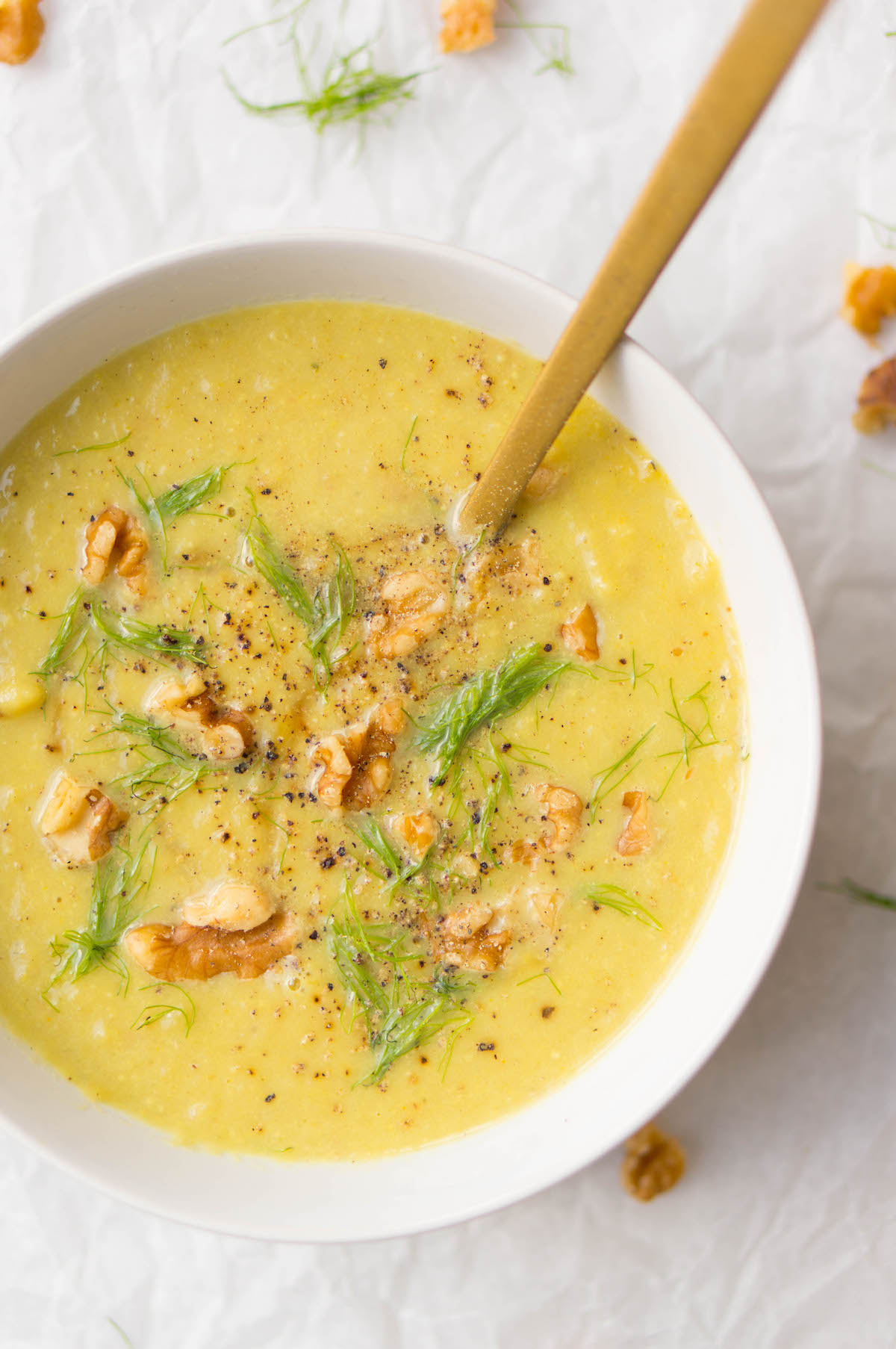 Deze preisoep met venkel, appel en walnoten heeft niet alleen een hartverwarmend mooie kleur, maar ook een hartverwarmend effect op je binnenste. We zouden het bijna soulfood noemen.