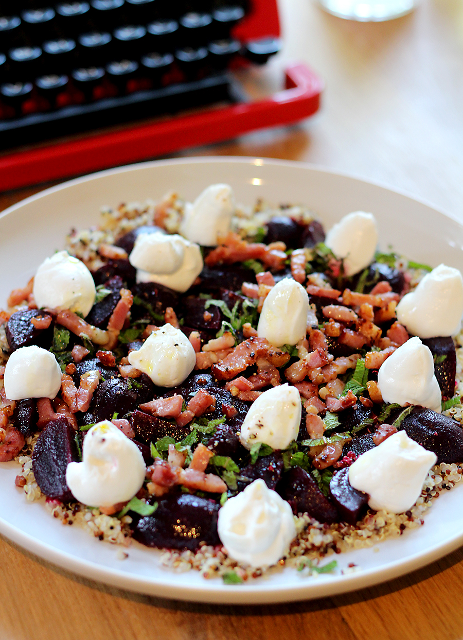 Quinoa met baby bietjes, geitenkaas en spekjes