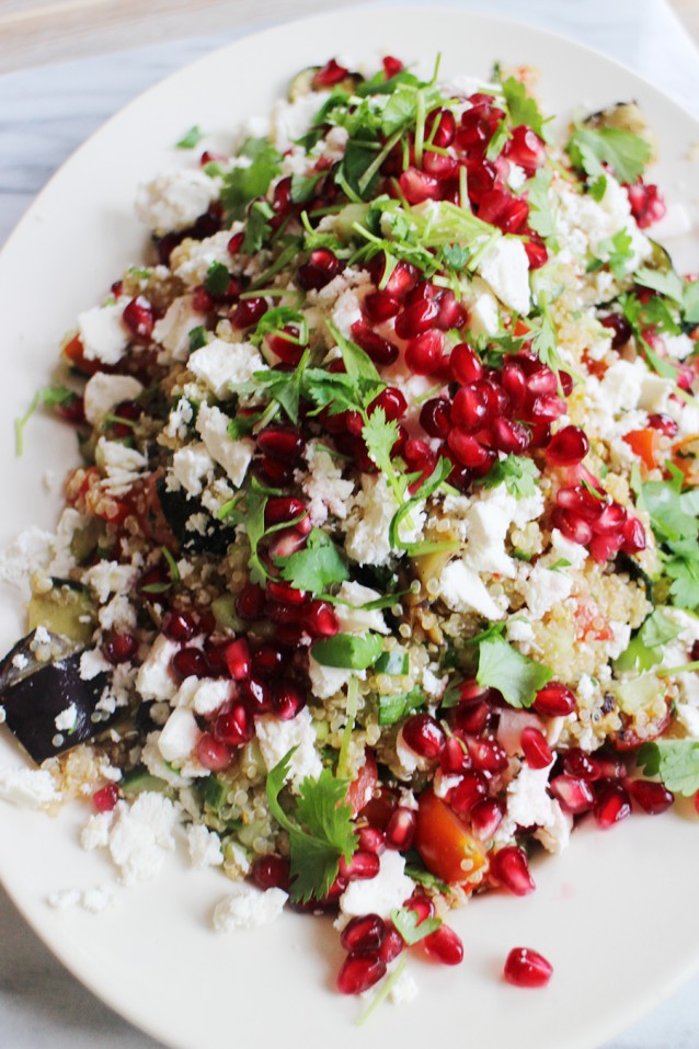 Quinoasalade met gegrilde groenten, granaatappelpitjes en feta