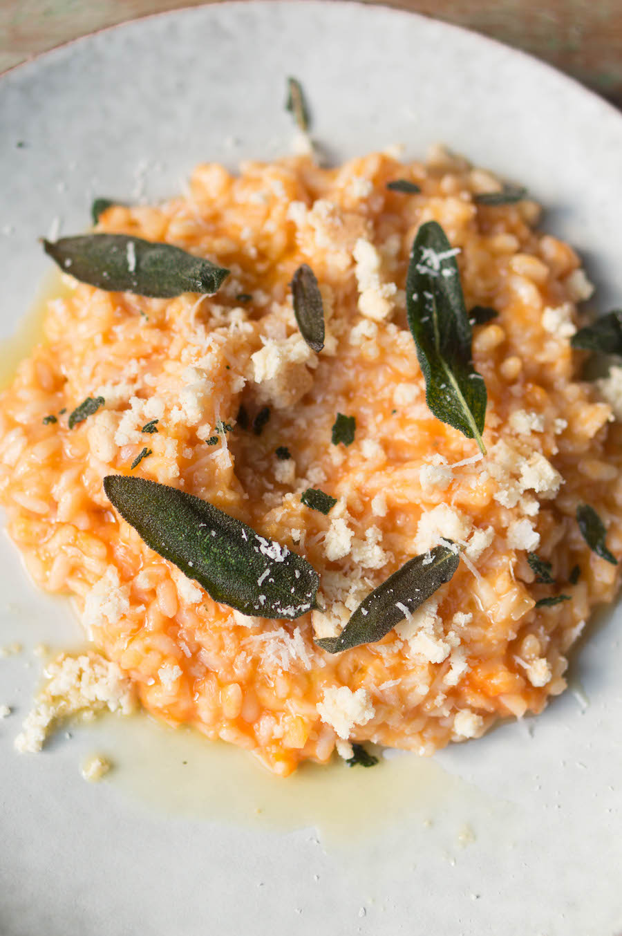 Pompoenrisotto met bitterkoekjes en knapperige salie