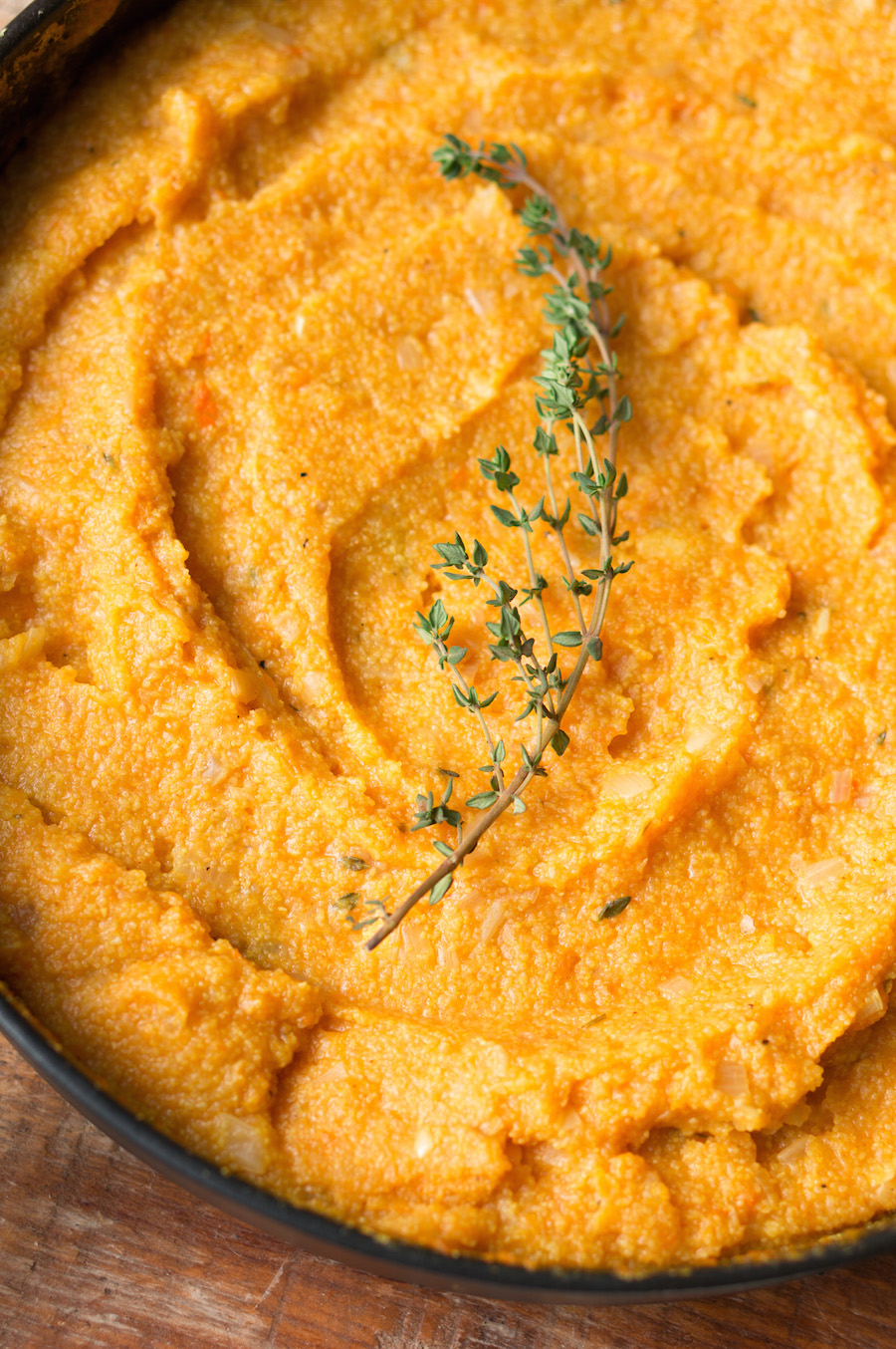 Daarna is je pompoen-polenta klaar! Maak af met wat zout en peper en verse tijm. Lekker bij deze geplette bieten.