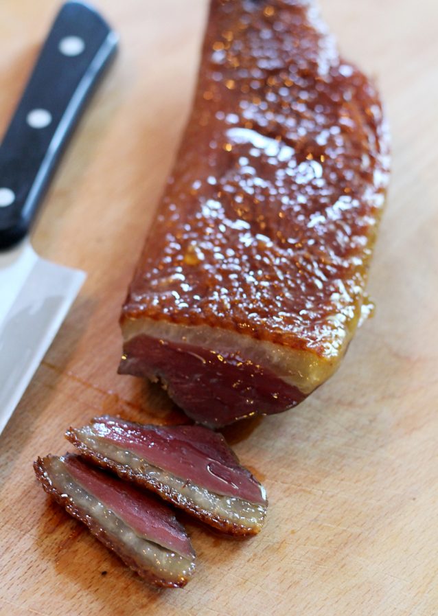 Koop bij een goede poelier een gerookte eendenborst in één stuk. Veel supermarkten verkopen ook gerookte eendenborst, maar die is dan al in plakjes gesneden. Dat kan ook, maar is een stuk minder lekker.