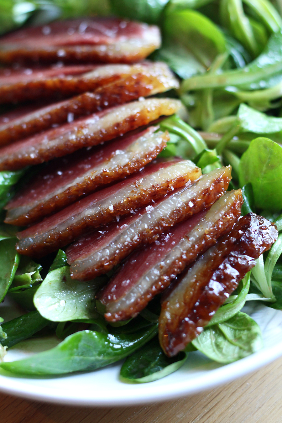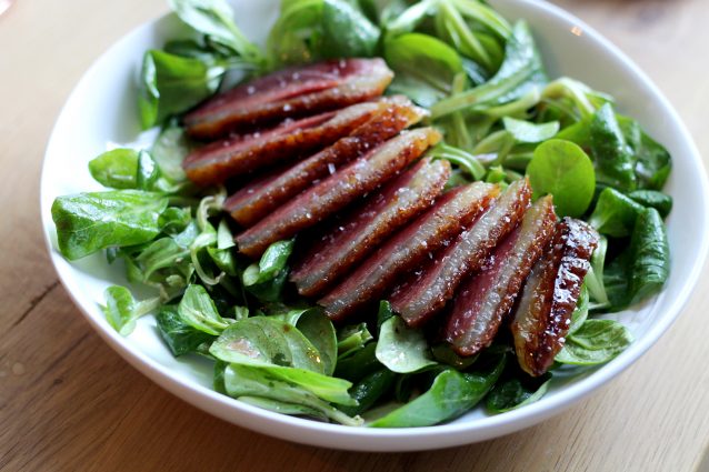 Meng de veldsla met de dressing en verdeel de salade over twee borden. Snijd de eendenborst in plakjes en leg op de salade. Breng op smaak met wat extra zeezout.