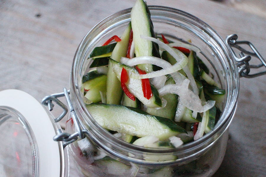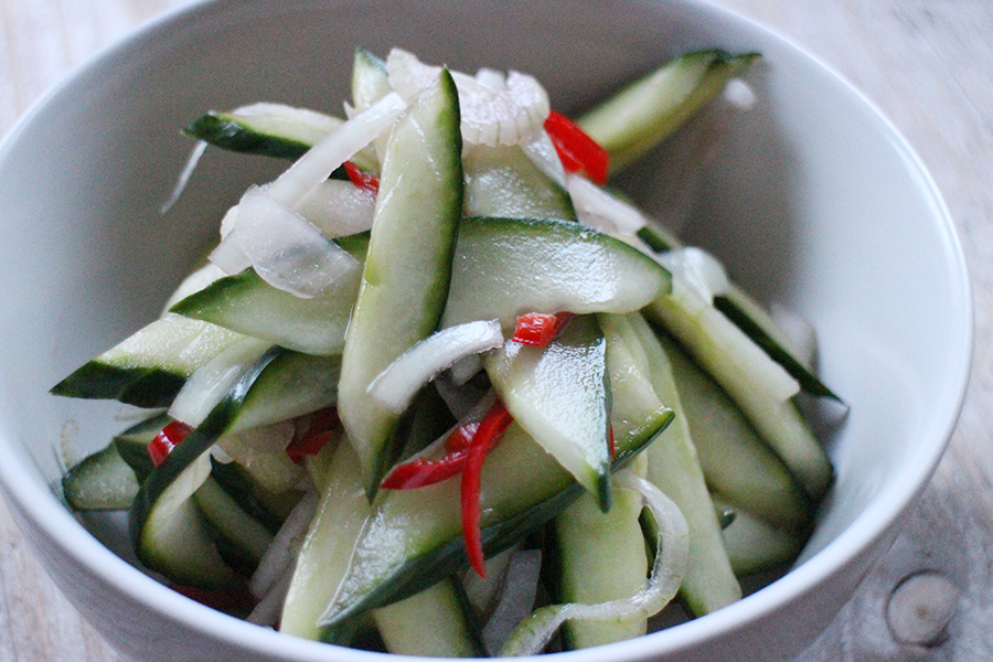 Voor ons is een Aziatisch getint maaltje niet compleet zonder zoetzure komkommersalade. Het is zo gemaakt en ideaal om in een grote pot in de koelkast te bewaren.Ā