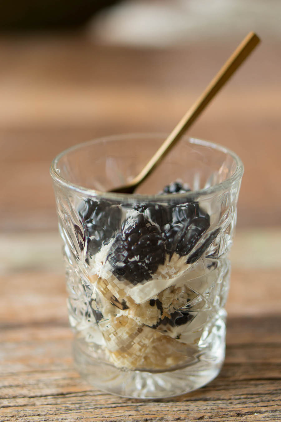 Verkruimel anderhalf amaretti koekje in het glaasje, herhaal met een laagje mascarpone en weer vijf tot zes bramen met wat geraspte witte chocolade.
