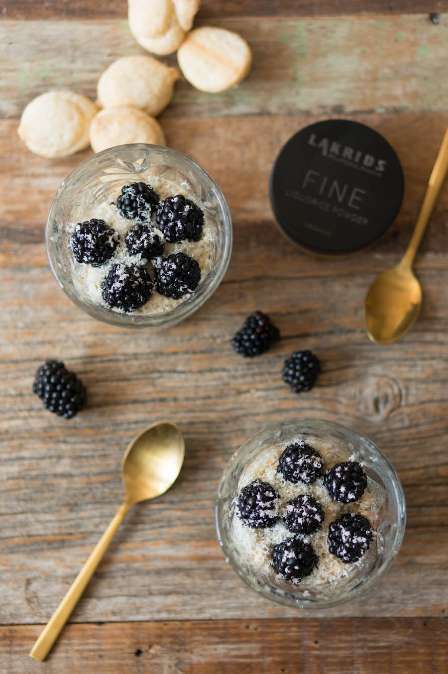 Voor dit dessert met bramen gebruikten we het fijne droppoeder van Lakrids, met een heerlijke salmiak smaak (online te koop). Maar je kunt ook harde salmiak snoepjes fijnmalen. Doe dat bijvoorbeeld in een vijzel of keukenmachine.