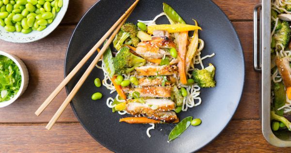 Deze snelle kip teriyaki is binnen een mum van tijd klaar. Met dank aan je bakplaat. Daarop bak je kippendijen en groente binnen een half uur gaar.