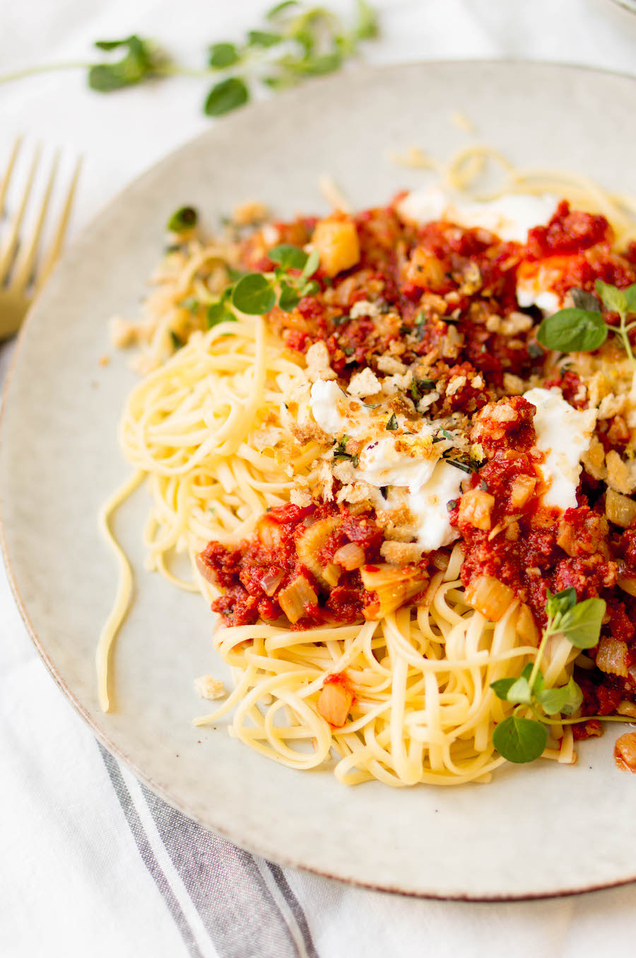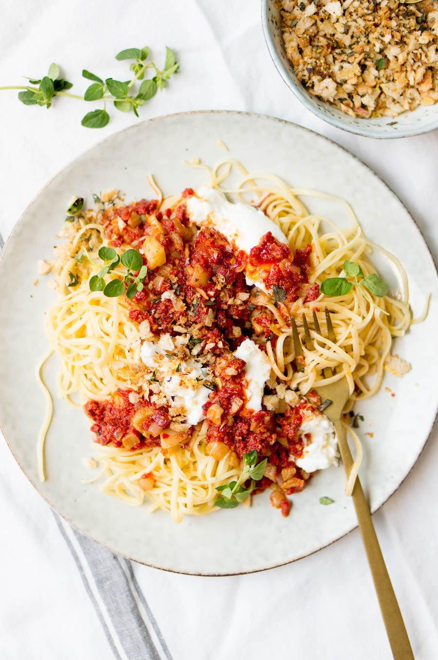 Schep de linguine op de borden en verdeel de bolognese erover. Scheur de mozzarella in stukjes en verdeel die over de pasta. Maak elk bord af met wat pangrattato en eventueel nog wat geraspte Parmezaanse kaas.