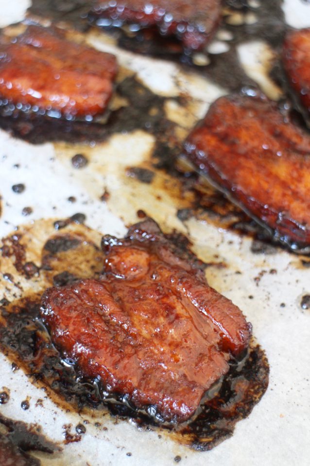 - Verwarm je oven voor op 180 graden en leg de speklapjes op een met bakpapier beklede bakplaat. Bak 35-40 minuten in de oven totdat het vlees gaar en zacht is, en de marinade plakkerig. Keer om de tien minuten de speklapjes om.