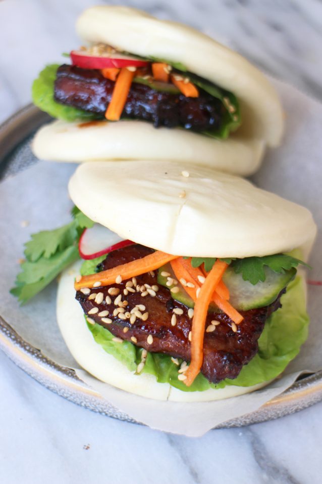 Bao buns (steamed buns) met speklapjes, hoisin en zoetzuur