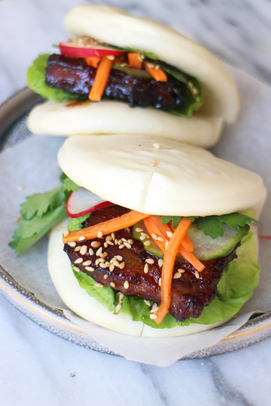 - Verdeel de sla over de steamed buns en beleg met een stukje vlees, een plakje komkommer, wat wortel en radijs. Garneer met koriander en sesamzaadjes, en eventueel nog Sriracha. Enjoy!