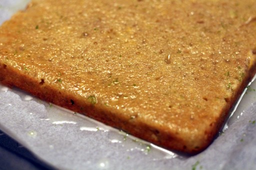 Haal de cake uit de oven en laat afkoelen. Maak ondertussen het glazuur door poedersuiker te mengen met limoensap. De verdeling is aan jou; hoe meer sap, hoe wateriger het glazuur wordt – dan is het iets meer een siroop dan een dikke glazuur. Proef ook goed. Voeg, als je glazuur de gewenste dikte heeft, de geraspte zest (schil) van de limoenen toe.