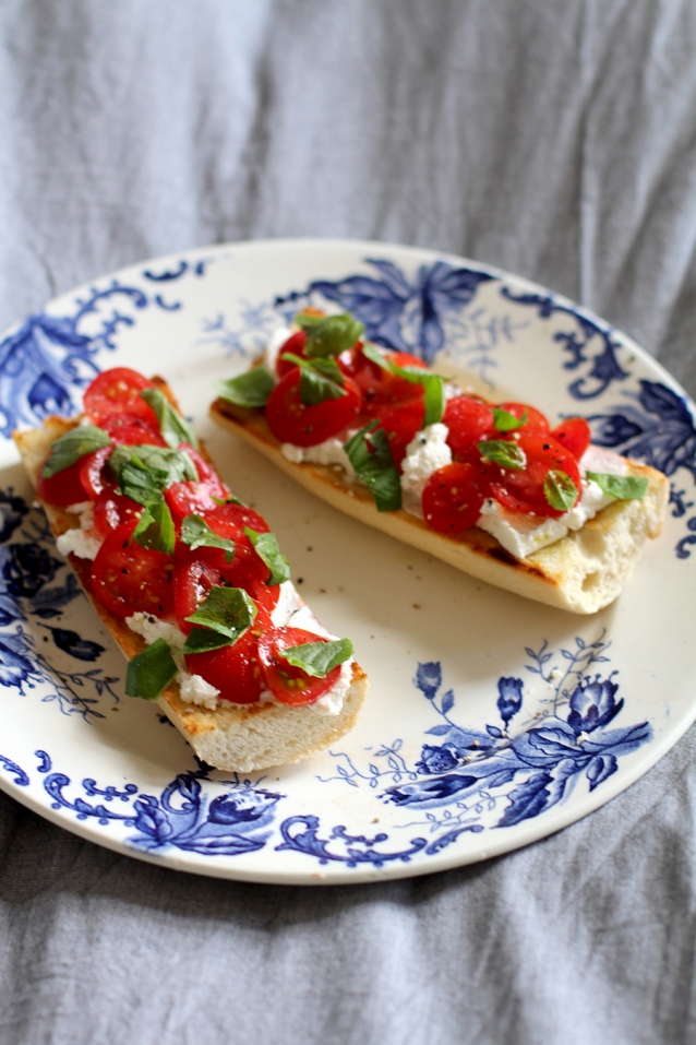 Snijd de cherrytomaatjes in plakjes en scheur de basilicum grof. Besmeer het geroosterde stokbrood vervolgens met de ricotta en beleg met de tomaatjes en basilicum. Maak af met peper en zout en extra vergine olijfolie.