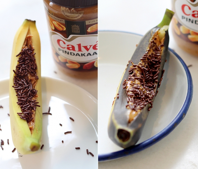Snij de banaan in de schil de lengte een stukje in, niet te diep. Leg de banaan op een hittebestendig bordje en besmeer de banaan (niet de schil) met een flinke eetlepel pindakaas. Bestrooi vervolgens met pure hagelslag, of pure chocolate chips.
