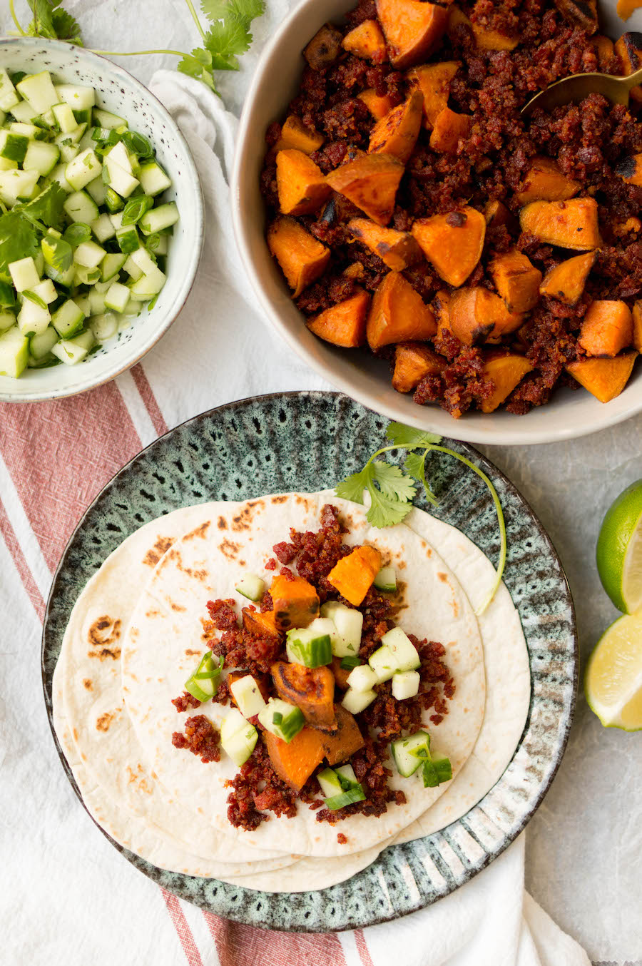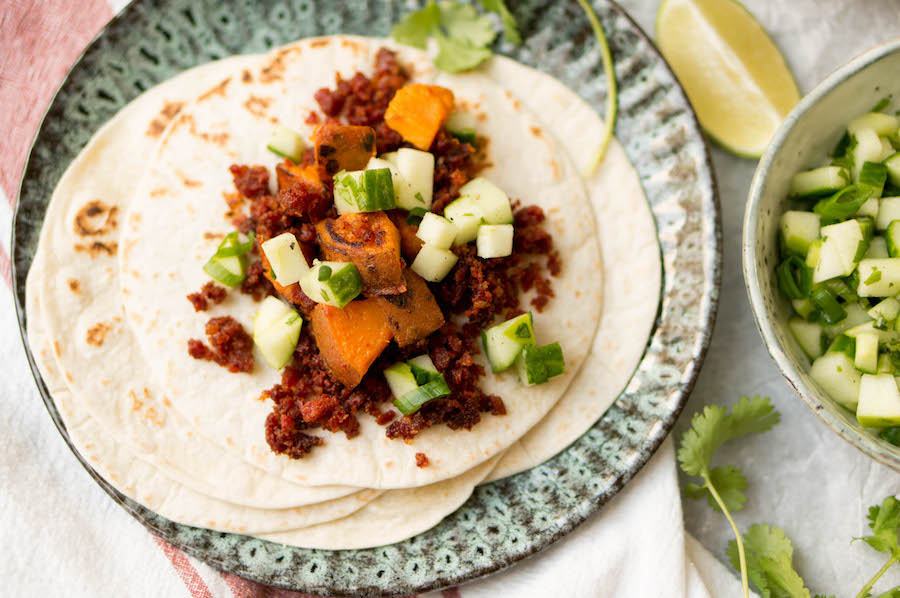 Taco’s met zoete aardappel, chorizo en appelsalsa